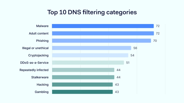 Research shows that the Domain Name System (DNS) filtering feature is also used for blocking phishing, cryptojacking, illegal, and DDoS as a Service (DaaS) websites. This way, employers try to protect their networks and systems from cyber threats and illegal activities.